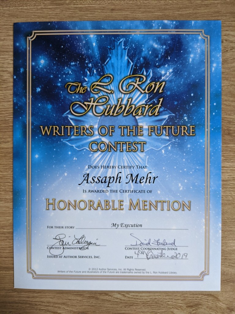 Then there are also small wins. I randomly got in the post an acknowledgement that My Execution received a honourable mention in the Writers of the Future context. This is the second short that achieves that (the first was Girl on Fire). Between those and the slowly dripping book reviews, it’s clear that my writing has some merit, and it’s not just my delusional, eccentric hallucination that others enjoy them.