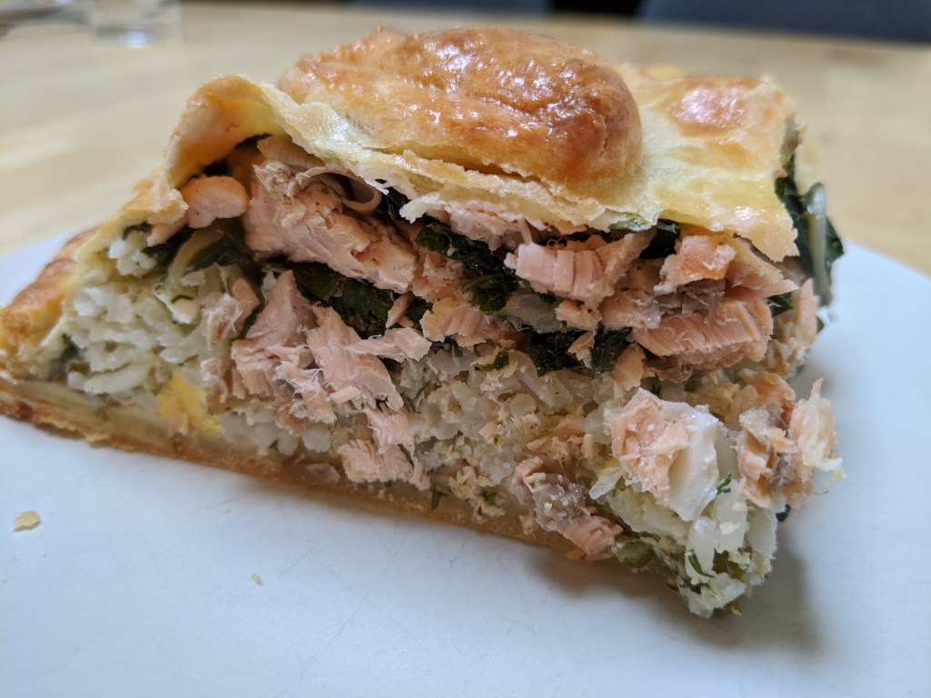 For the interested, I did a layer of rice mixed with dill, shallots, diced boiled eggs, and sour cream, followed by a single layer of mixed salmon, mushrooms, and silverbeet (chard). It took a long while (three hours), because many components need to be done separately: cook the rice, boil the eggs, then mix together with the herbs and cream. Sear the salmon, then (in same pan) saute the mushrooms, and (again in the same pan) cook the chard leaves. During this I made the dough and let it rest (short-crust with egg and milk), and cooked the blini (which means every two minutes I had something to flip). Maximum efficiency with a minimum of time and pots, but it was still very much not a weekday dinner.