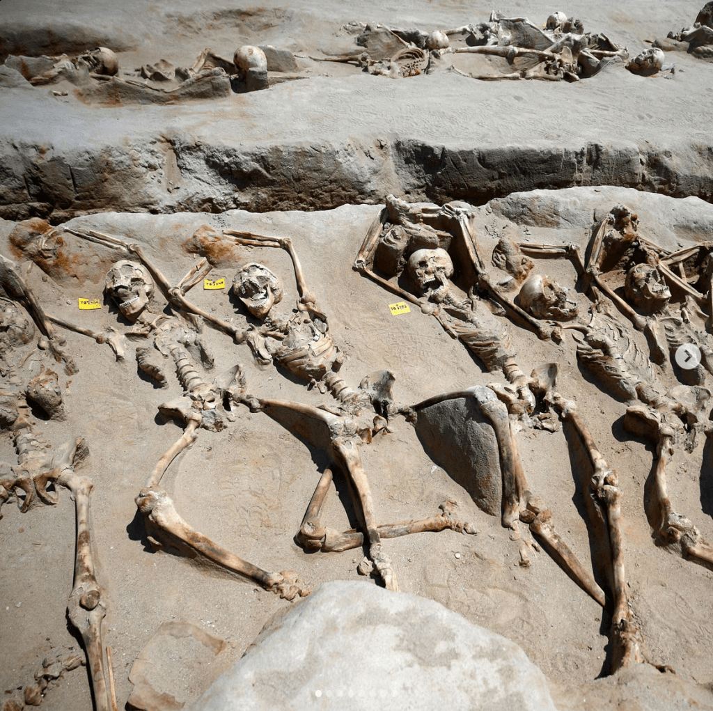 On a lighter note, there are always the Instagram memes and random factoids. Many are not necessarily correct (ie rubbish), so you should always double check. Still, you can find good sources. The below scene is obviously gruesome, a mass burial of chained war prisoners, circa 632 BC from a site south of Athens. (The reddish tinge around the hands, and maybe leg bones, together with the pose indicate iron manacles that have rusted away). But since this post is all about inappropriate jokes, there’s something about their poses that’s reminiscent of danse macabre and all it’s missing is a bit of party hats and whistles 🥳. Now let’s hope their wandering spirits won’t come to school me in appropriate burial rituals.