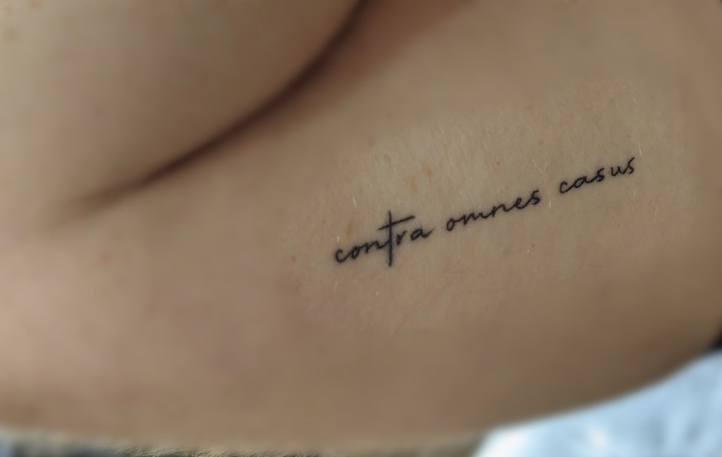 Part of a language is also the culture behind it, and I know this isn’t how a Roman would express the thought behind it. Felix might say something like “despite Fortuna’s will” (and probably immediately regret it, because his patron goddess is fickle and quick to anger). And that’s beside the fact that Roman citizens viewed tattoos as a branding for slaves, not something they’d ever willingly subject themselves to.