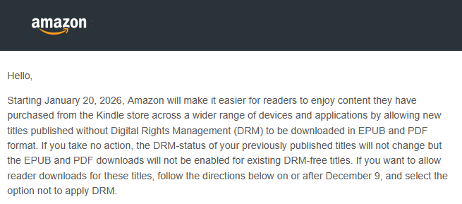 By introducing DRM and disabling downloads, Amazon isn’t really doing anything against piracy but they are inconveniencing legitimate readers and making things hard for them. So they could lock them out, if they feel like it. This whole “Your books will be downloadable unless you enable DRM” is actually Amazon’s sneaky way to scare authors and ensure things stay within their ecosystem (because it’s the legitimate readers who will lose access, not the pirates). All so they can better fund Bezos’ space dick.