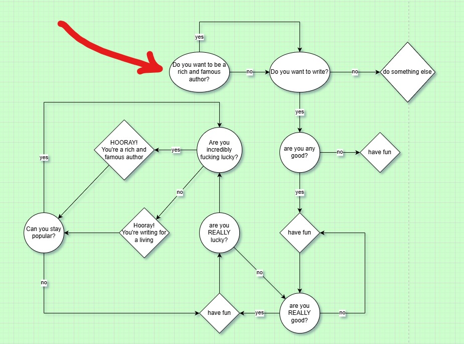 Mark Lawrence published this flowchart on Facebook. Pretty much sums it up — unless you’re talented AND extremely lucky, you’re best bet is to just enjoy writing for the sake of it. Even a successful, famous fantasy author is basically telling you not to stress and have some fun 🙂
